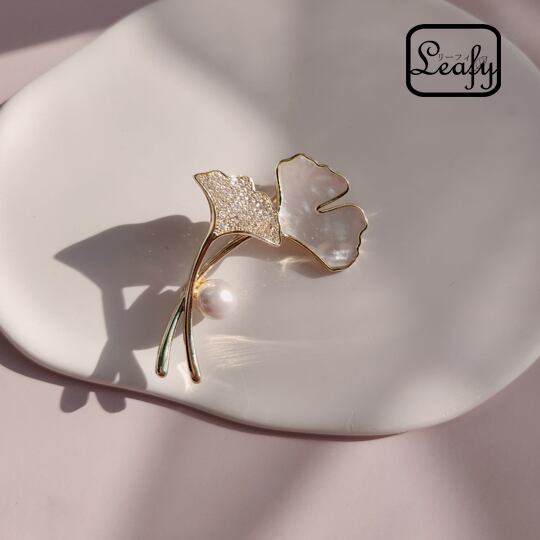 Terse白蝶貝とパールが織りなす上品な輝きが特徴の銀杏モチーフブローチ CZダイヤが華やかさを添え、どんな装いにも優雅さをプラス 特別な日のおしゃれや、日常のアクセントとしても活躍 洗練された美しさを求める方にぴったり 自然の美しさを感じさせる一品 br0015a