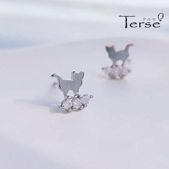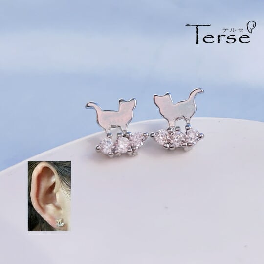 Terse 雲ようなCZダイヤの上にお散歩ネコのピアス猫好きにはたまらないアイテムです 大人なイメージのピアスなので、猫モチーフでも子供っぽくならずに着用できます プレゼントにもお勧めの商品です キュービックジルコニア 可愛い 猫 ねこ ミニピアス sa0180a