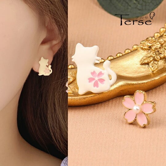 「Terse 桜と座る猫デザインスタッドピアス」は、どの角度から見ても愛らしさが際立ち、耳元に特別なアクセントをプラスします。軽やかなデザインでデイリーユースにも最適ですが、特別な日の装いにもぴったりです。自分へのご褒美や、大切な方へのギフトとしても最適なアイテムです!