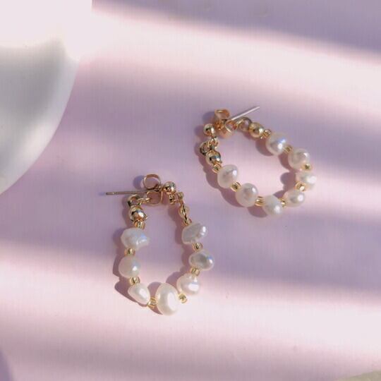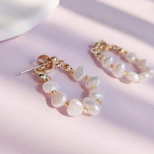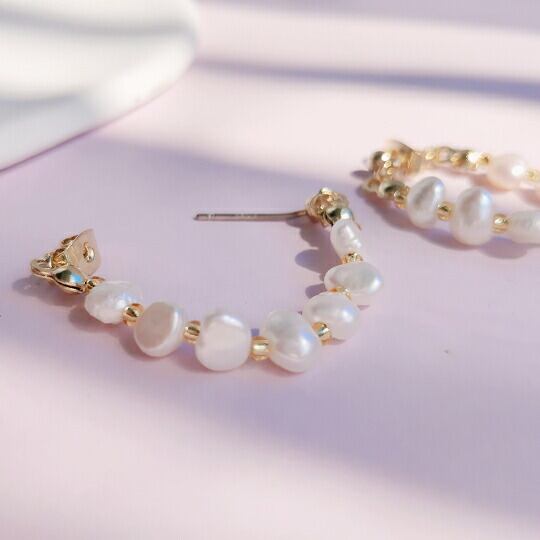 Leafy いびつ感のあるナチュラルなバロックパールを繋げたフープピアス いつものコーディネートにプラスするだけ顔まわり華やかに フープデザインなので小顔効果が狙えるのも高ポイント シンプルなデザインで合わせるものを選ばない どんなシーンでも 冠婚葬祭 x09375a