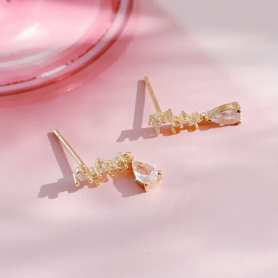 Leafy ポスト部分にはCZダイヤモンドがあしらわれ、その下に揺れるキュービックジルコニア4石が下に向かってグラデーションを描くピアス 動きに合わせて揺れ感が楽しめます 小さな爪で留められた繊細な輝きが横顔に華やぎをプラスしてくれそう ドロップピアスx09442a
