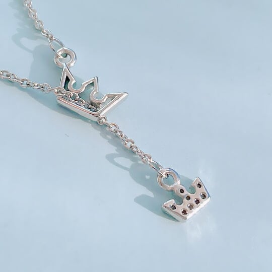 ■憧れのクイーンをイメージした特別なアイテム!「Terse ありそうでなかったクラウンモチーフのCZダイヤY字ペンダント」は、小ぶりでありながらも存在感を放つデザインが特長です。繊細なクラウン(王冠)モチーフには、キュービックジルコニアが巧みにセッティングされ、光を受けてきらめく様子はまるで女王のような優雅さを感じさせます。胸元にピッタリフィットするサイズ感が魅力で、どんなスタイルにも華やかさをプラスしてくれることでしょう♪