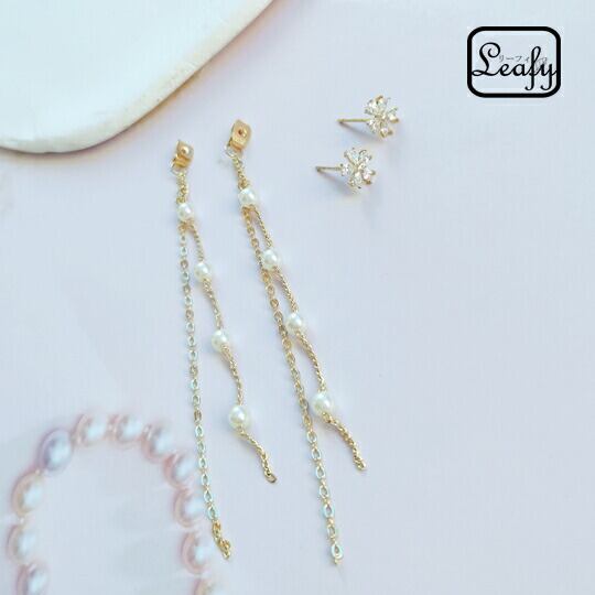 Leafy 2wayジルコニアフラワー付き☆流れるようなラインのロングパールピアス ゴールド 1ペア レディース スウィング ゆれ感 お洒落 綺麗 小顔効果 お出かけ イベント パーティー 二次会 食事会 女子会 デート 普段使い 冠婚葬祭 入園式 sr00141yg ロングピアス