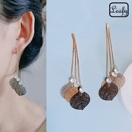 Leafy おしゃれな透かし彫りのピアス スリーカラーが豪華薄くて軽いリーフピアス レディース 葉っぱ 葉 新緑 落ち葉 紅葉 三枚 チェーン ロング 金 銀 黒 ゴールド シルバー ブラック お出かけ イベント デート 二次会 パーティー 普段使い プレゼント sr00434y