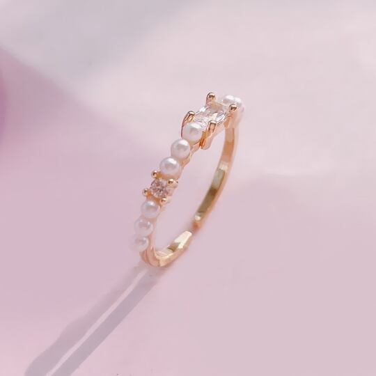 Terse 小粒のパールが並んだ、真ん中にスクエアCZダイヤ、ノーブルなデザインが魅力のリング カラーストーンとのコーディネートにも使いやすく、どんなスタイルにもなじむ指輪は、ヘビーユース間違いなし 結婚式などのフォーマルシーンにもお着けいただける rs0300a