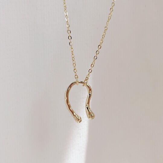 幸運を呼び込む、槌目模様のホースシューモチーフペンダント!「Terse 幸運を招くお守りとされている槌目模様ホースシューモチーフペンダント」は、特別なU字の型が特徴で、幸せを溜め込むという意味を持っています。インパクトのあるデザインながらも、上品でモードな印象を与え、さまざまなスタイルにマッチします。シャツの襟からのぞかせても、首つまりトップスに重ねても、トレンド感満載なコーディネートが楽しめるアイテムです。