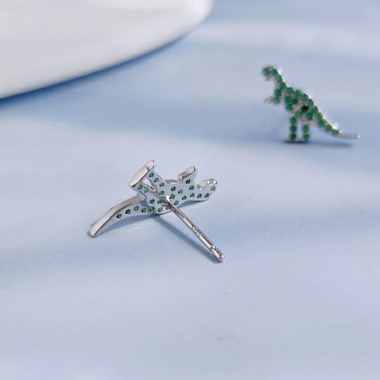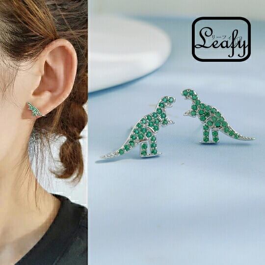 Leafy エメラルドグリーン色CZダイヤを敷き詰められたティラノサウルス ピアス 恐竜のモチーフが時を超えてあなたを照らします 狙った獲物は何としてでも捕らえる最強の肉食恐竜 いつも明るくパワー溢れる女性におすすめ 大人の可愛い スタッドピアス 辰年 干支 x09459a