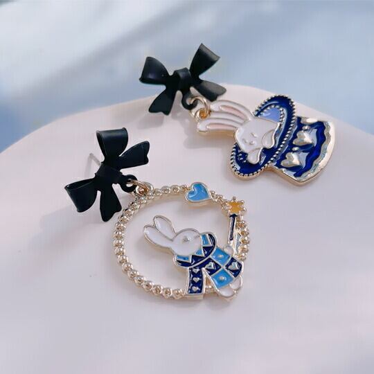 春の幻想を耳元に、Terse ゴシック&ロマンティックなマジックウサギ&シルクハットモチーフのアシンメトリーピアス!