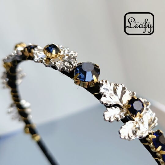 Terse様々な大きさや形のビジューを組み合わせ、草花モチーフのような美しさがあるカチューシャ 間の葉も上品な光沢を放ち美しい。動くたびにキラキラ輝くha0093a