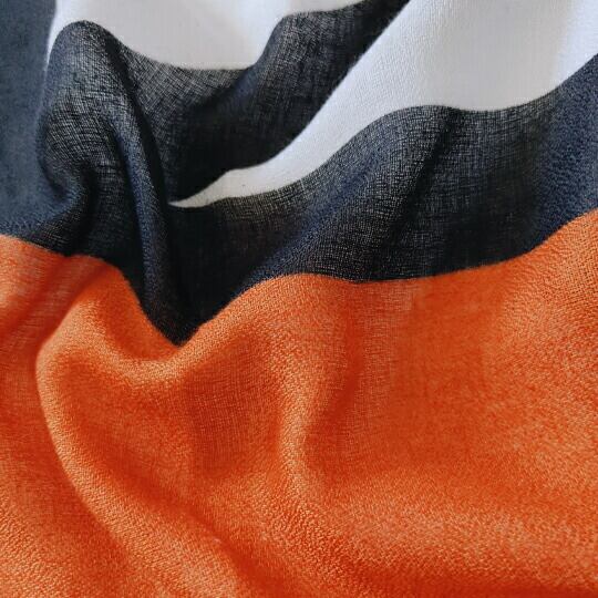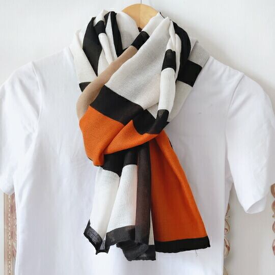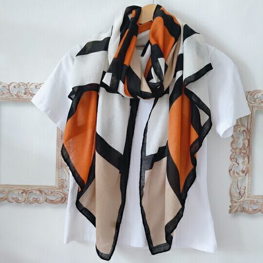 鮮やかなオレンジとベージュの色合いが目を引く大判ストール 幾何学模様が施されたこのアイテムは、シンプルながらも洗練されたデザインが特徴で、どんな服装にも簡単に合わせ 白いTシャツに巻かれたこのスカーフは、カジュアルな装いに華やかさをプラスma0352aor