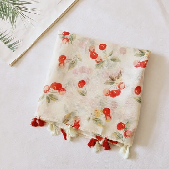 手描きのさくらんぼ柄が魅力的な大判ストール さくらんぼのデザインは「幸運」や「豊穣」「楽園の果実」といった象徴的な意味を持ち 身に着けるだけで特別な気分に 軽やかな素材感が特徴で、春夏のファッションにぴったり 薄手でありながら日焼け止め効果ma0362a