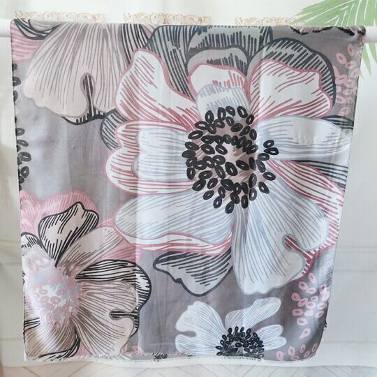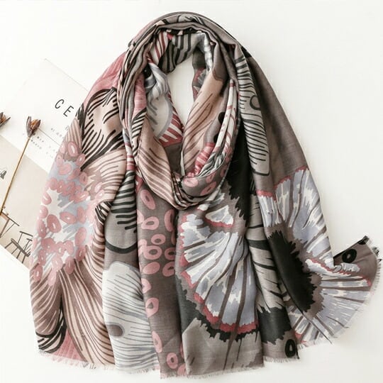 グレーとピンクを基調としたくすみカラーの大きな手描きのフラワーデザイン大判ストール 優しい色合いで、落ち着いた上品な印象を与え 年齢を問わず多くの方に好まれる一品 発色が控えめで、どんな装いにも自然に馴染み、日常のスタイルをさりげなく引き立 ma0360a
