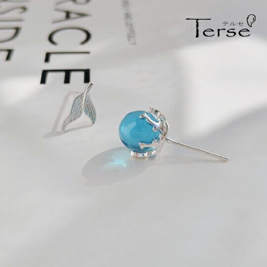 この「Terseブルークリスタルの人魚の涙と人魚の鱗に見立ててフィッシュテールのマーメイドアシメピアス」は、幻想的な人魚の世界をイメージした特別なアクセサリーです!太陽の光を受けるとキラキラと輝き、耳元で美しい雫のような輝きを放ちます。人魚が恋人を想って流した涙が波にはじけて宝石となり、船乗りたちのお守りとして語り継がれる魅力を持つアイテムです。