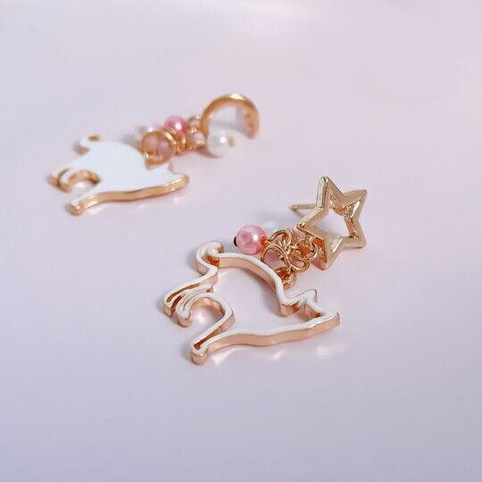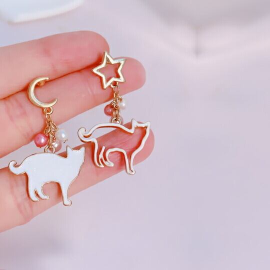 Leafy きらきらラメ入り白猫ちゃんピアス 1ペア レディース アシンメトリー 左右非対称 キャット ねこ アニマル 動物 スター 星 ムーン 月 お出かけ イベント デート パーティー 二次会 食事会 女子会 普段使い プレゼント sa0130awh