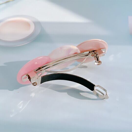 この「Leafy マーブル&シンプルカラーのトリプルサークルバレッタ」は、ピンクとベージュの美しいトーンが特徴です。トリプルサークルのデザインが髪に華やかさを与え、髪留めとしてだけでなく、髪飾りとしてもお楽しみいただけます。お出かけやイベント、デート、パーティーなど、さまざまなシーンで活躍すること間違いなしです!