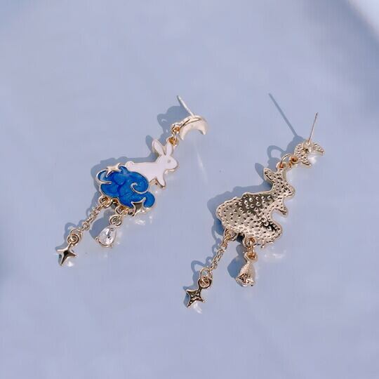 Terse お月見うさぎのピアス 縁起の良いデザイン 見る人を惹きつけます お月見を耳元から可愛いうさぎ達と風に揺れる雲が耳元で可憐に輝きます ピアスの一番上には三日月もキラキラ ぶら下がりデザインで、耳元を飾るだけでおしゃれなアクセントになるアイテム バレンタイン 彼女 sa0216a