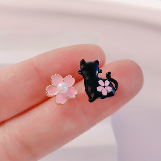 Terse愛らしさたっぷりな、桜と座る猫をモチーフにしたデザインスタッドピアス 人気のキャット ピアス 左右非対称 黒猫は福猫として魔除けや幸運、商売繁盛の象徴とされます さくら 4月誕生花 ハロウィン サクラの花言葉は精神の美 優雅な女性 バレンタイン 彼女 sa0168abk