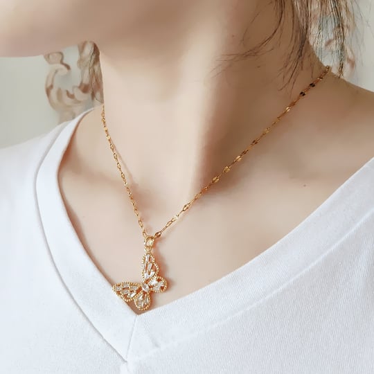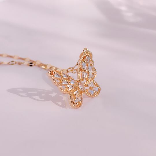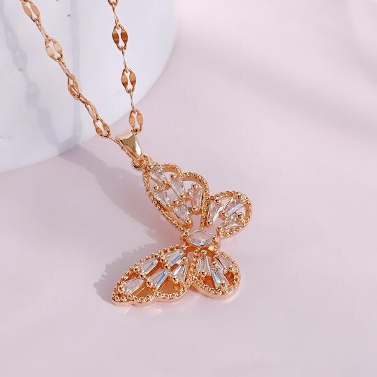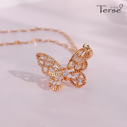 細長いバゲットカットのキュービックジルコニアが散りばめられた美しいバターフライのペンダント 花の周りをひらひらと舞う蝶々をイメージしたネックレス さなぎから美しい姿に生まれ変わることから「美しさ」や「成長」を意味するラッキーモチーフ