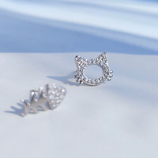 個性的なデザインが魅力のアシンメトリーピアス!「Terse 上品なシルバー☆ネコちゃんと骨になったお魚さんのアシンメトリーピアス」は、愛らしいネコとユニークな魚のモチーフを組み合わせた、心に響くアクセサリーです。デイリーコーディネートだけでなく、デートやパーティーでも華を添えるアイテムとして活躍します☆