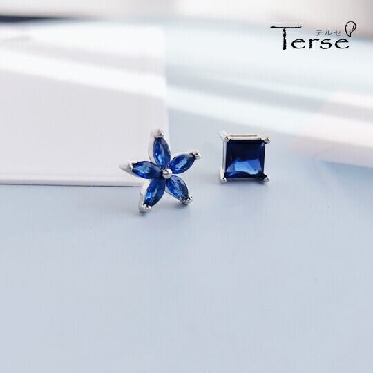 Terse 身につけていると幸せを運んでくれる5枚花&スクエアモチーフ左右非対称ピアス とても綺麗なサファイア色CZダイヤ を贅沢に5ピースずつ使用した美しいピアス 誠実・慈愛・賢明・徳望の意味を持つ 9月誕生石 ノンホール変更可能 バレンタイン 2026 ギフト 女性 彼女 妻 母 友チョコ 幸運 お守り サファイア CZ 左右非対称 アシンメトリー 軽量 華やか 上品 サプライズ 感謝 ホワイトデー 返し ノンホール 対応 sp0203a 2月誕生花