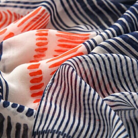 「ボーダー柄をミックスしたストール」は、巻き方によってさまざまな表情を楽しめる、多用途のアイテムです。柔らかい素材とさらっとした肌ざわりが特徴で、快適さも抜群!薄手で軽量なデザインは、晩夏の冷房対策にも最適です。長い期間お使いいただけるので、季節を問わず活躍します☆