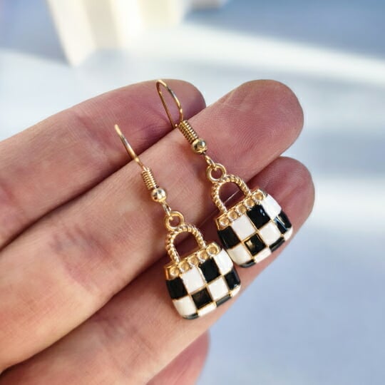 Terseピアス 1ペア レディース フックピアス 黒 ブラック チェック柄 バッグかばん 鞄 ゴールド 金 かわいい 楽しい 人気 お出かけ パーティー デート 普段使い プレゼント バレンタイン 2026 ギフト 彼女 妻 母 友チョコ チェック柄 バッグ 鞄 遊び心 軽量 上品 サプライズ 感謝 ホワイトデー 返し se0120a
