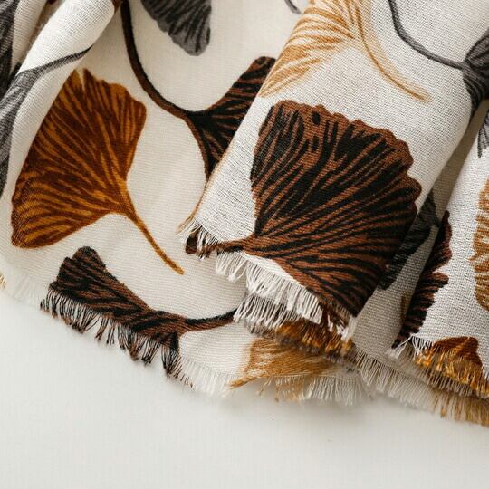 銀杏の葉が美しくデザインされたストール 暖色系の色合いが白地に映え、上品でお洒落な印象を与え 秋の装いにぴったりのアイテムで、どんなスタイルにも自然に溶け込み 軽やかな素材感が心地よく 幅広く活躍 季節感を取り入れたファッションを楽しみ ma0361abe