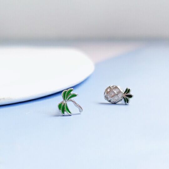 Terse 南国の香りが漂ってきそうなかわいいパイナップル&やし ピアス 1ペア 網目模様 ユニーク フルーツ 果物 パイン 旅行 熱帯 夏 銀 緑 リゾート シルバー925 左右非対称 ミニ 夏 海 休み 南国気分 花火 面白い バレンタイン 2026 ギフト 彼女 妻 母 友チョコ パイナップル ヤシ 南国 リゾート 夏休み 旅行 軽量 上品 サプライズ 感謝 ホワイトデー 返し sp0186a