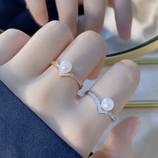 「Terse シンプルなCZダイヤVライン&1粒フェックパールリング」は、洗練されたVラインデザインと、ひと粒のフェックパールが絶妙に組み合わさった美しいリングです☆ 光を受け入れながら、しっとりとした優しい光沢を放ち、清楚でエレガントな雰囲気を醸し出します。日常使いはもちろん、パーティーや入学式といった特別なシーンにもぴったりのアイテムです。