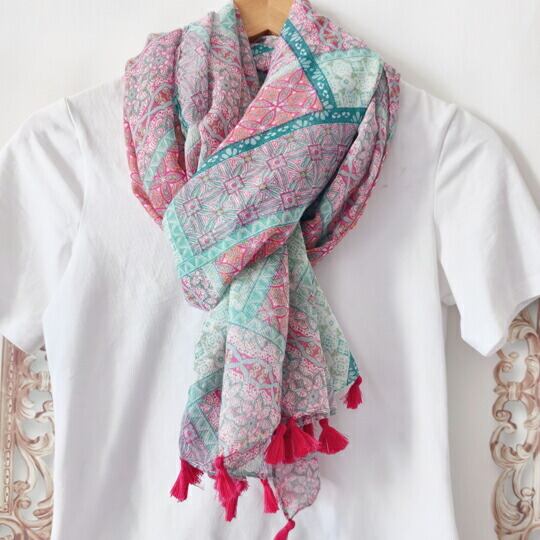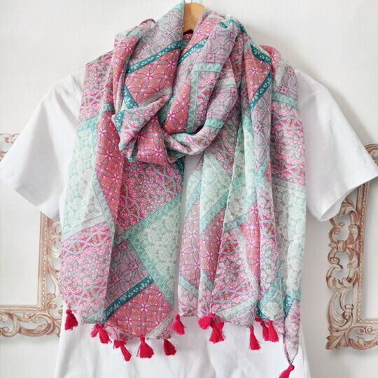 春の訪れを感じさせるのパーチワークプリントストール ピンクとグリーンの色合いが美しく調和し、永遠性、豊かさ、繁栄、循環の意味も持っていたアラベスク模様が優雅さを引き立てますこのストールは、春の装いに華やかさを添えるアイテムとして最適 バレンタイン 2026 ギフト 彼女 妻 母 友チョコ パーチワーク アラベスク ピンク グリーン 繁栄 永遠 軽量 上品 サプライズ 感謝 ホワイトデー 返し ma0371a