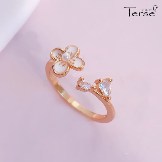 Terseの「Terse小さいなホワイトエナメルのフラワーが印象的なCZダイヤフォークリング」は、可憐なホワイトエナメルのフラワーデザインが特徴の洗練された指輪です。キュービックジルコニアのキラキラとした煌めきが指元を優雅に演出し、特別な日にも日常使いにもぴったりなアイテムです。