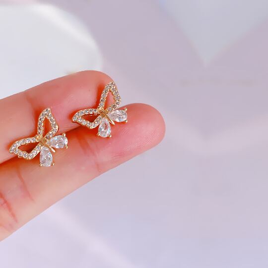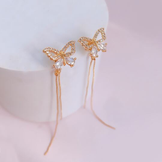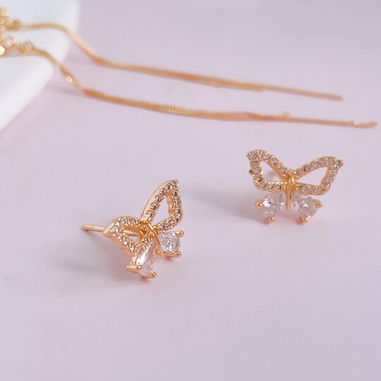 Leafyリーフィ チェーンがついたキュートな蝶々のピアス 1ペア 縁取りのジルコニアがお顔周りを一層華やかに レディース 普段使い プレゼント お呼ばれ パーティー 二次会 バタフライ ゴールド 【昆虫】x09073ag 春 ロングピアス