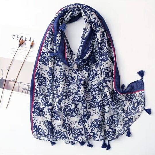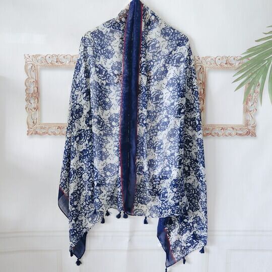 ホワイトカラーの地にネイビーフラワープリントをしている大判ストール お顔を明るく見せてくれます 幾何学柄の縁取りと深みのあるカラーリングが、落ち着きのある大人の雰囲気を演出します 日差しが気になる季節にぴったり リゾート ショール 羽織 UVカット ma0244a