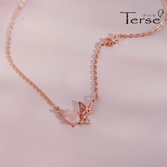 Terse 可愛らしい蝶がお花びらのまわりを飛んでいる様子をデザインしたペンダント ヒラヒラと自由に飛んでいる様子を表しているバタフライネックレス ピンク石と透明感高いキュービックジルコニアが爽やかな印象を与えてくれます 肌に優しいピンクゴールドsn0330a