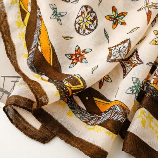 クラシカルなデザインに落ち着いた配色が魅力の大判ストール フラワーやフェザー、ベルト柄を組み合わせた遊び心あふれるスカーフ 巻き方によって見える柄が異なるので様々な表情を楽しめて便利しわになりにくい素材を使用 大判サイズなので、存在感も抜群 ma0218abr