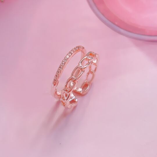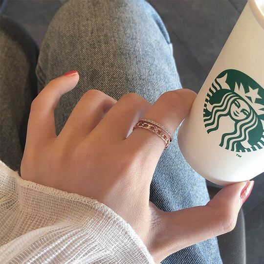 「Terse 2連 チェーン風CZダイヤ オープン リング」は、キラキラと輝くチェーンデザインが指元を華やかに飾ります。高級感あふれるキュービックジルコニアが施され、エレガントな印象を与えるとともに、デイリー使いにもとても適したアイテムです☆