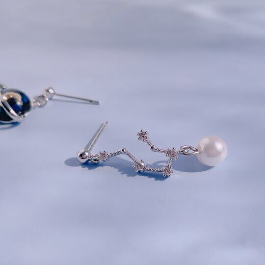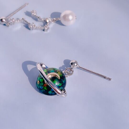大人の女性にぴったりなロマンチックな宇宙ピアス!「Leafy 北斗七星&土星に三日月を閉じ込めたロマンチックコスモピアス」は、独特のアシメントリーデザインが魅力的なアイテムです。星や惑星の美しさを耳元で楽しめるこのピアスは、特別な瞬間や日常のお出かけを華やかに彩ります☆