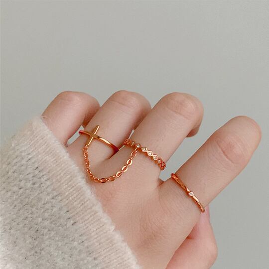 「Terse 使い方いろいろリングセット」は、2つの指輪がチェーンで繋がったユニークなデザインが特徴のアイテムです☆ シンプルながらも洗練された十字架のモチーフが魅力的で、どんなファッションにも自然にマッチします。日常使いから特別な場面まで、幅広いシーンであなたの個性を引き立てる素敵なリングセットです。