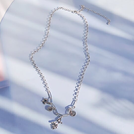 「Terseのぶら下がるテディが何とも愛らしいネックレス」は、シルバートーンのブラスペンダントが動くたびにゆらゆら揺れ、見る人を笑顔にする可愛らしいデザインが特徴です☆ チャンキーチェーンにスター&CZダイヤチャームが配され、カジュアルなスタイルにも華やかさをプラスします。独特のベアモチーフが、一際目を引き、あなたのコーディネートを一層引き立てます。