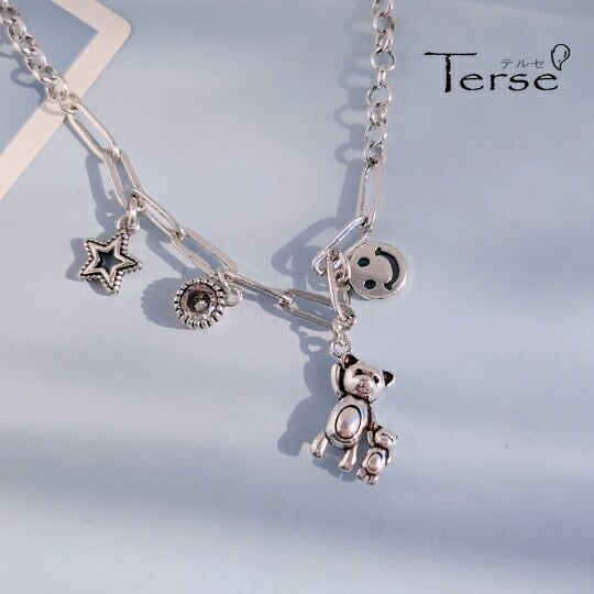 Terse ぶら下がるテディが何とも愛らしい ネックレス 動くたびにゆらゆら揺れる姿が とっても可愛い シルバートーンブラスペンダント ベアとスマイルなスタイルが融合 チャンキーチェーンにスター&CZダイヤチャーム配されたデザイン ぬいぐるみ子熊 くま sn0313a