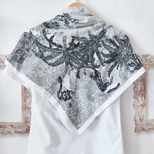 南国リゾートの庭園を思わせるデザインのスクエアスカーフ。熱帯植物からインスピレーションを得たプリントが、柔らかな印象を醸し出します。グレー、ホワイト、ブラックを基調としたシックなカラーリングが、どんな装いにも上品さをプラス。日常のコーディネートに取り入れることで、洗練されたエレガントな雰囲気を演出します。