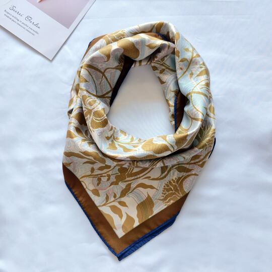夏にぴったりのペイズリーテーマを基にしたデザインのリバーシブルスカーフ 豊かな生命力や優雅さを象徴するペイズリー柄が描かれ、反対面にはザクロと植物のモチーフが調和して配置され エレガントな雰囲気を演出 縁に施されたネイビーとブラウンのラインが全体を引き締め シーンに応じて異なる表情を楽しめる両面仕様
