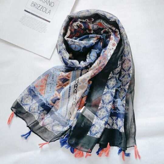 華やかな薄手大判薄手ストール 普段のコーディネートに取り入れやすい、深みのある落ち着いたカラーリング 幾何学模様がアクセントに 巻くだけでスタイリッシュに決まるエスニックな柄 巻き方次第で雰囲気が変わるので飽きのないアイテム 肌ざわりの良い素材 ma0283a