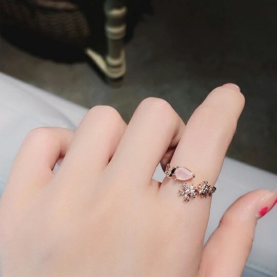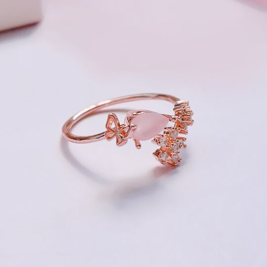 大人の女性にぴったりな可愛らしい蝶フォークリング!「Terse 可愛らしい蝶がお花のまわりを飛んでいる様子をデザインしたフォークリング」は、繊細な蝶と花のデザインが心を奪う魅力的なアイテムです。このリングは、ピンク石の花びらを巧みに回りながらヒラヒラと飛ぶ蝶の姿を見事に表現しており、特別なお出かけやデートに華やかさをプラスします☆