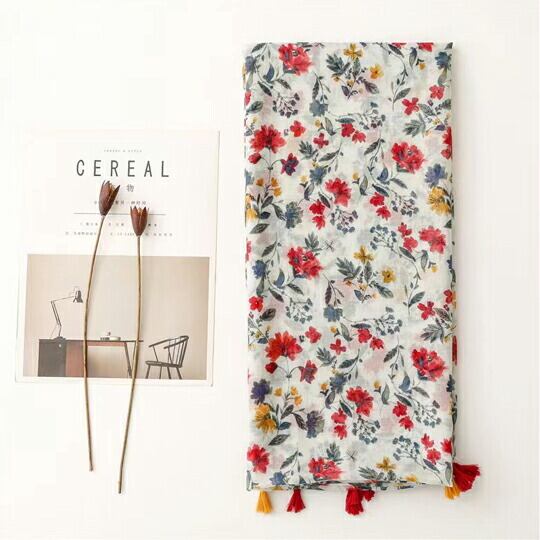 日々のコーディネートに華やかさをプラスするレトロなふわわ―ストール 透け感のあるふわりと軽い素材感 どこか素朴な温かみのある小花柄が上品です 大小様々な花がデザインされたエレガントな一品 スカーフ タッセル付き コスモス リゾート ma0246a
