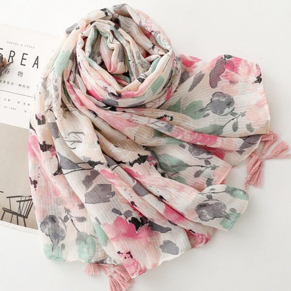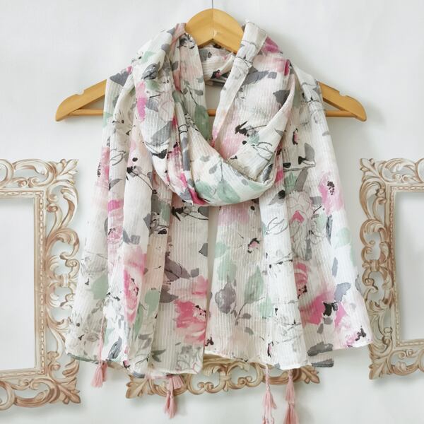 春にぴったりの水彩フラワーテーマを基にしたデザインのスカーフ 墨絵風の大輪の花柄が描かれ、ピンクとグリーンの調和が優雅に配置され アーティスティックな雰囲気を演出 裾に施されたピンクのタッセルが全体を柔らかく引き締め シーンに応じて異なる表情を楽しめる薄手仕様 ma0412a