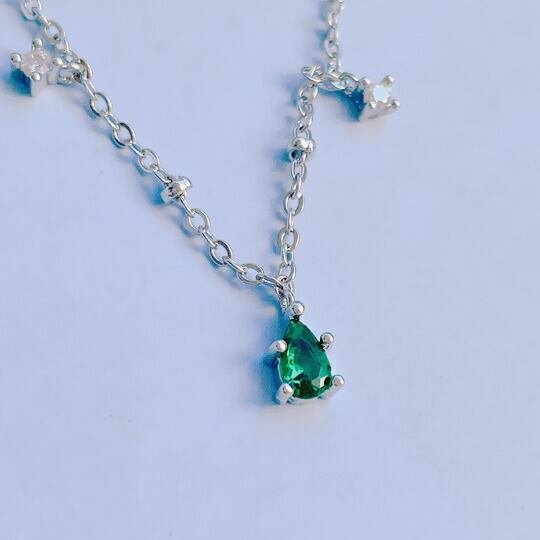 Terse ランダムに飾られたエメラルドグリーンCZダイヤが、華やかな雰囲気へと導いてくれるネックレス こちらは小粒のドロップビジューが光をたっぷりと閉じ込めてキラキラと首元で輝きます 仕事 食事会 パーティーシーン等、幅広く活躍してくれそう sn0304as 5月誕生石