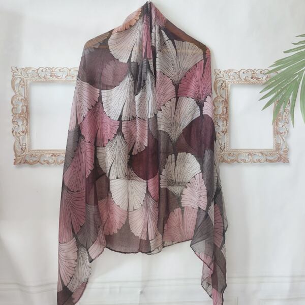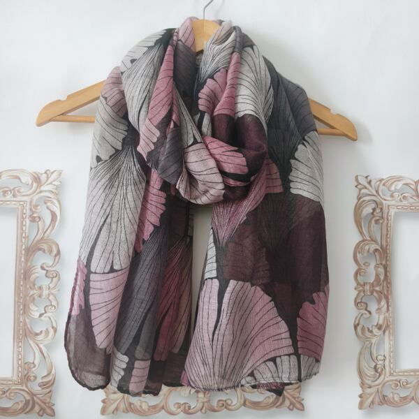 秋にぴったりのイチョウ葉テーマを基にしたデザインのスカーフ ピンク / ベージュ / ブラック / ホワイトの調和が優雅に描かれ、ナチュラルで落ち着いた雰囲気を演出 裾に施されたタッセルが全体を引き締め シーンに応じて異なる表情を楽しめる薄手仕様ma0413apk