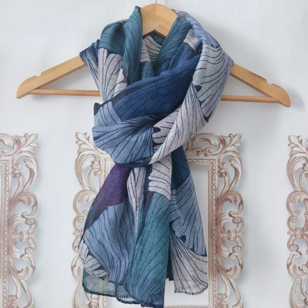秋にぴったりのイチョウ葉テーマを基にしたデザインのスカーフ ブルー / グリーン / パープル / ホワイトの調和が優雅に描かれ、モダンで落ち着いた雰囲気を演出 薄手のビスコース素材で肌触りが良く、シーンに応じて異なる表情を楽しめる ma0413apu