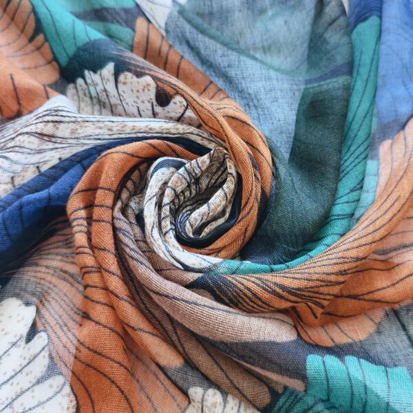 秋にぴったりのイチョウ葉テーマを基にしたデザインのスカーフ グリーン / ブルー / ブラウン / ホワイトの調和が優雅に描かれ、秋らしい豊かな雰囲気を演出 薄手のビスコース素材で肌触りが良く、シーンに応じて異なる表情を楽しめる ma0413agr
